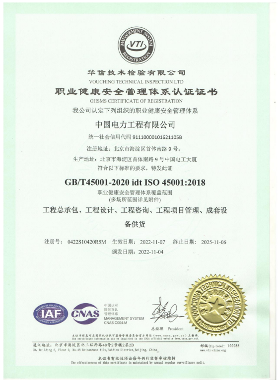 ??????? 為了進一步提高企業經營、管理和服務水平,接軌國際標準化管理要求,中國電力工程有限公司于2019年展開了ISO三合一體系的認證準備工作,并順利通過了審核,獲得了華信技術檢驗有限公司頒發的ISO9001質量管理體系認證證書、ISO14001環境管理體系認證證書以及ISO45001職業健康安全管理體系認證證書。
