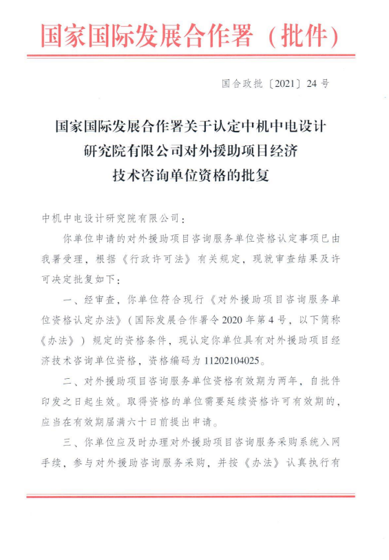 中機中電設計研究院對外援助項目經濟技術咨詢單位資格